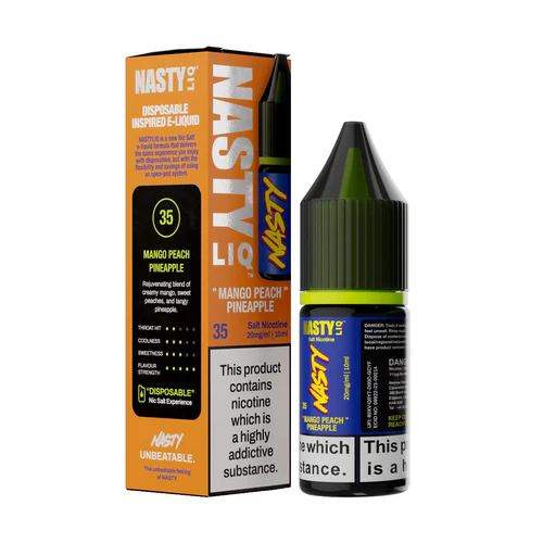 Enjoy Nasty Liq Mango Peach Pineapple nic salt in your choice of 10mg or 20mg nicotine strengths.